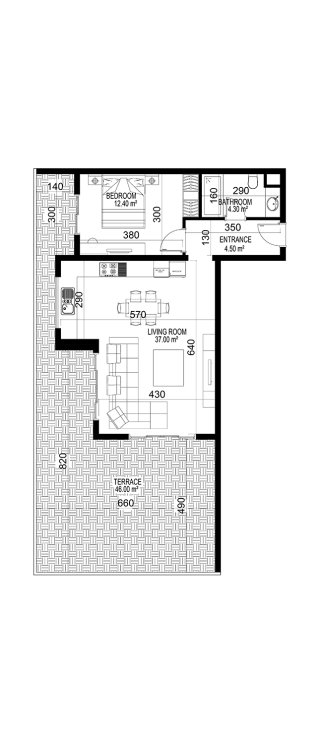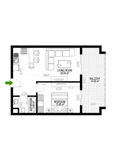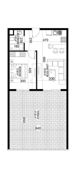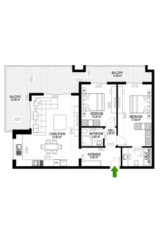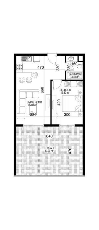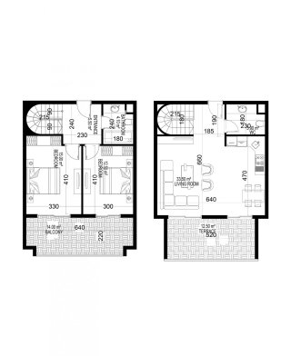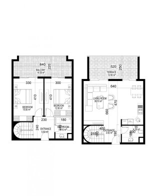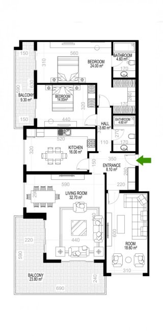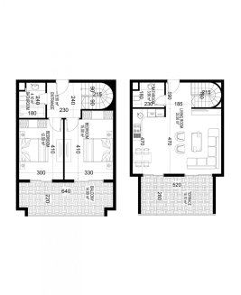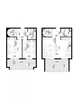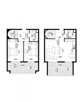 К покупке доступны 1- и 2-уровневые апартаменты в планировках 1+1, 2+1, 3+1 и 4+1. Площадь варьируется от 68 до 388 м².